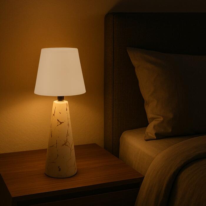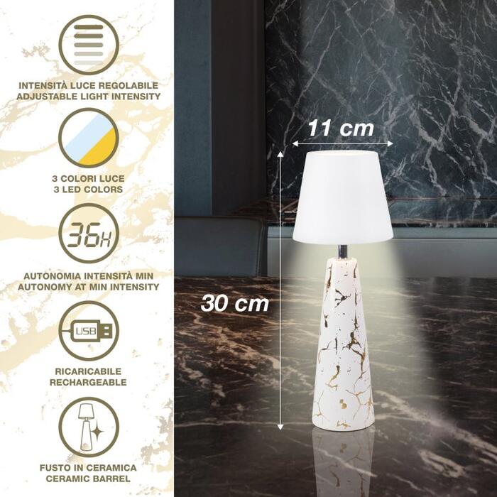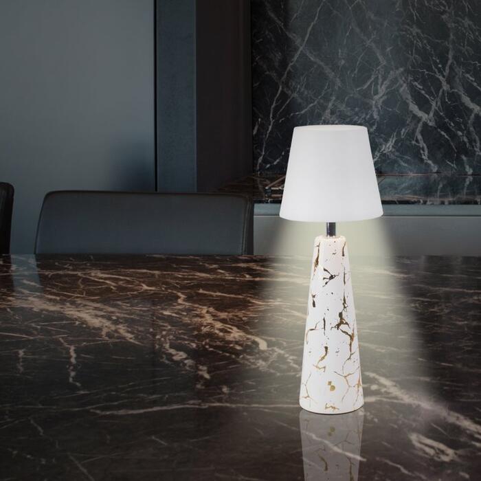 Перезаряжаемая настольная лампа MARBLE Beper с керамическим цоколем под белый мрамор и золотыми деталями — это больше, чем просто источник света: это элегантный и современный предмет интерьера, идеально подходящий для любой комнаты.
