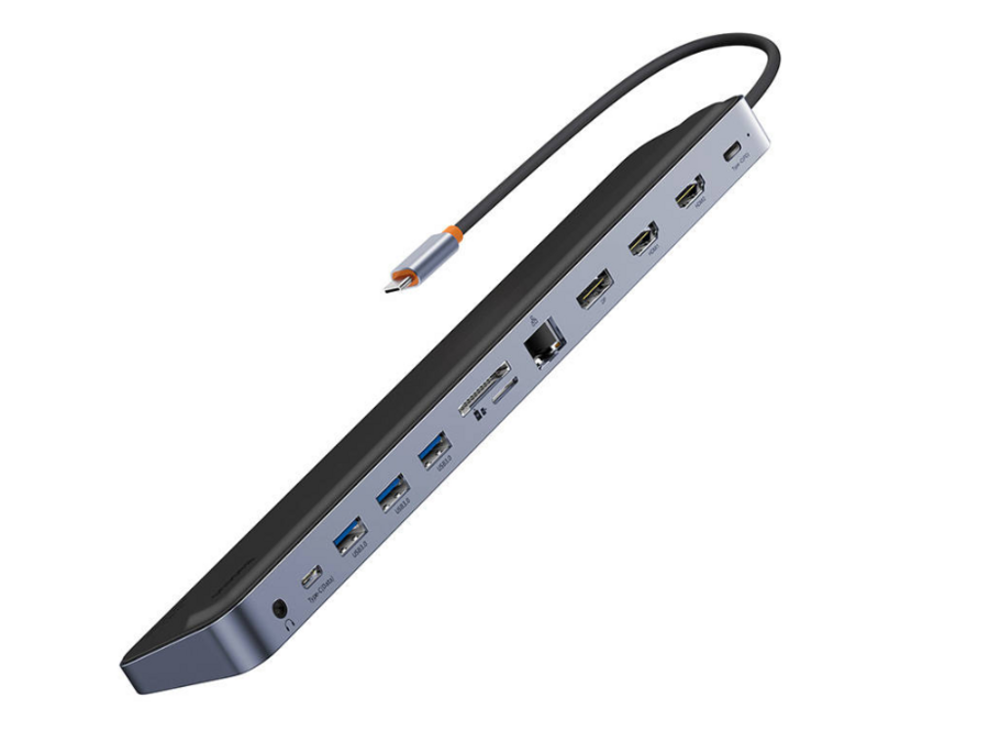 Впечатляющий интерфейс концентратора решает проблему нехватки места для подключения дополнительных устройств к вашему ноутбуку. Устройство оснащено портом USB-C, рассчитанным на быструю зарядку PD мощностью 100 Вт, портами 4K HD2, 4K HD1 и DP, с помощью которых вы можете подключить к своему ноутбуку до 3 дополнительных дисплеев. В вашем распоряжении также входы для карт TF / SD, 3 x USB 3.0, USB-C, так что вы можете легко и быстро передавать данные с карт или флэш-накопителей на свой ноутбук. Нет недостатка в 3,5-мм аудиоразъеме для наушников и входе RJ45 для подключения сетевого кабеля.