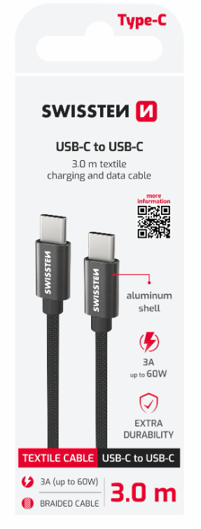 Swissten Textile Универсальный Quick Charge 3.1 USB-C / USB-C Кабель данных и зарядки 3м Черный