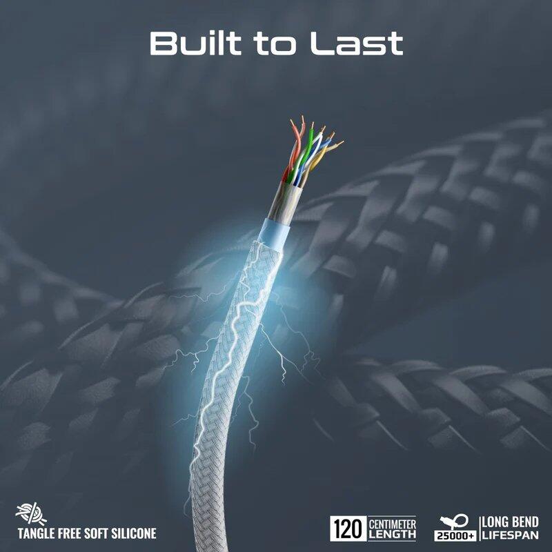 • Надежный снаружи: Износостойкая ПВХ оболочка в нейлоновой оплетке и протекторы возле коннекторов выдерживают более 10000 сгибаний.