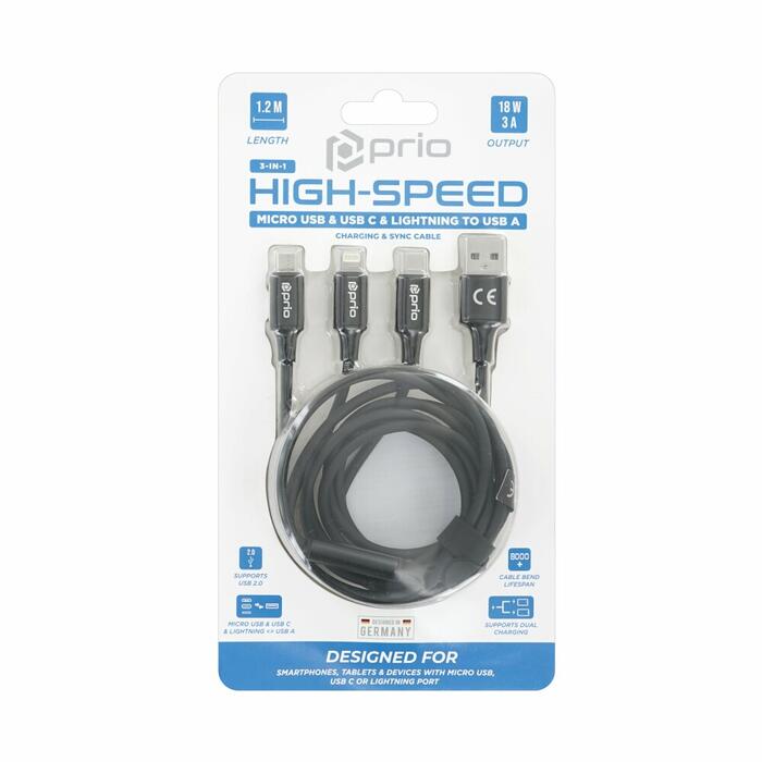 prio 3in1 Micro USB & USB C & Lightning to USB A Cable 3A 1.2m black