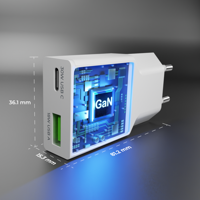 Мощное и компактное настенное зарядное устройство с портами USB C и USB A с технологией GaN.