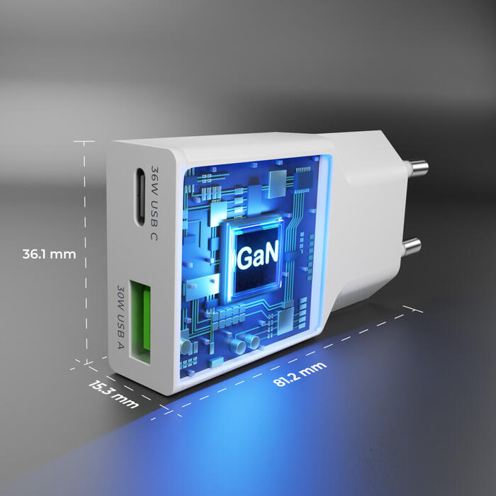 Мощное и компактное настенное зарядное устройство мощностью 36 Вт с портами USB C и USB A с технологией GaN.