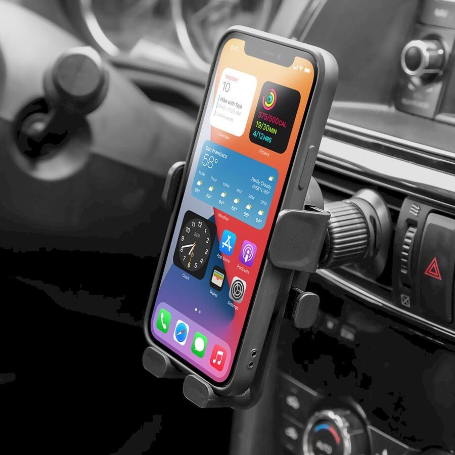 Вставив телефон в держатель, его вес активирует механизм блокировки, который надежно фиксирует телефон на месте.