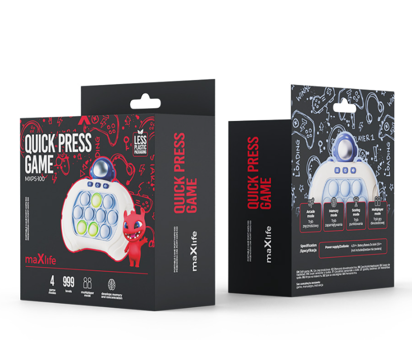 Портативная игровая приставка Maxlife PopIt MXPS-100 - это аркадная игра, которая помогает улучшить память и концентрацию. Она оснащена четырьмя игровыми режимами и 999 уровнями, что позволяет самым маленьким игрокам расслабиться и снять стресс. Игра включает в себя нажатие на пузырьки в нужный момент, что развивает воображение, творческие способности, а также концентрацию внимания и ловкость. Игра предлагает различные сенсорные ощущения с помощью нажатия кнопок и дополнительных звуковых и световых эффектов.