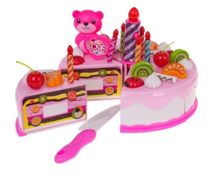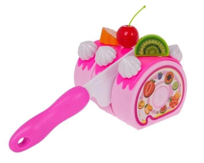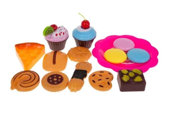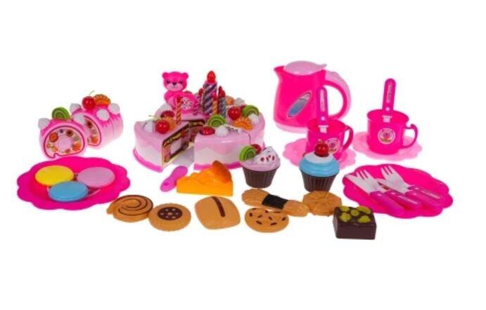 Красивый большой набор - праздничный торт со свечами для детей от 3-х лет. Всего в коробке 80 элементов. Торт состоит из 6 частей, соединенных липучками. Торт можно "разрезать" ножом, входящим в комплект. В торте предусмотрены небольшие отверстия для его декорирования. Большое количество аксессуаров предоставляет неограниченные возможности начинающим кондитерам. Ребенок может украсить торт по своему усмотрению, используя свечи и другие украшения, что положительно сказывается на фантазии и ручных навыках. Большая свеча светится двумя цветами (нажмите кнопку на свече). Свеча питается от батареек RL41 (входят в комплект). Особенности набора: - предназначен для детей от 3-х лет, - изготовлен из пластика самого высокого качества в ярких цветах, - богатая комплектация, - торт и рулет на липучках, их можно "разрезать" и украшать, - световые эффекты - свеча светится двумя цветами. Размеры - упаковка приблизительно. 28 см х 19 см х 9,5 см. Состав набора: - 6 кусочков торта (всего приблизительно 8,5 см х 15 см), - 7 свечей, в том числе одна большая, зажженная (прибл. 7 см х 2 см – большая свеча, 4,5 х 0,5 см – маленькая свеча), - 12 меренг (прибл. 2 см х 2 см), - 5 вишен (приблизительно 4,5 см х 2,5 см), - плюшевый мишка (приблизительно 6 см х 3,5 см), - 4 киви (приблизительно 2,5 см х 2,5 см), - 5 ягод клубники (приблизительно 2,5 см х 1,5 см), - 5 мандаринов (приблизительно 2,5 см х 1,5 см), - 5 палочек для глазури (приблизительно 2,5 см х 1,5 см), - 2 кекса (приблизительно 5 см х 6 см), - 11 различных форм печенья (разной формы, размеры приблизительно 6 см х 5 см), - 3 кусочка рулета (всего приблизительно 7,5 см х 7,5 см х 6 см), - 2 ножа поменьше (прибл. 11 см х 2 см), - большой нож (14 см х 2,5 см), - 2 чайные ложки ок. 10 см х 2,5 см, - 2 вилки прибл. 10 см х 2,5 см, - 2 чашки (прибл. 5 см х 7 см), - рулет примерно 7,5 см х 6,5 см, - 4 тарелки (маленькая диаметром около 10 см, большая диаметром около 13,5 см), - чайник примерно 10 см х 11 см х 4 см, - свисток - декоративные наклейки.