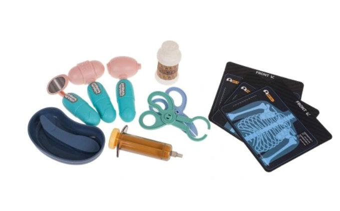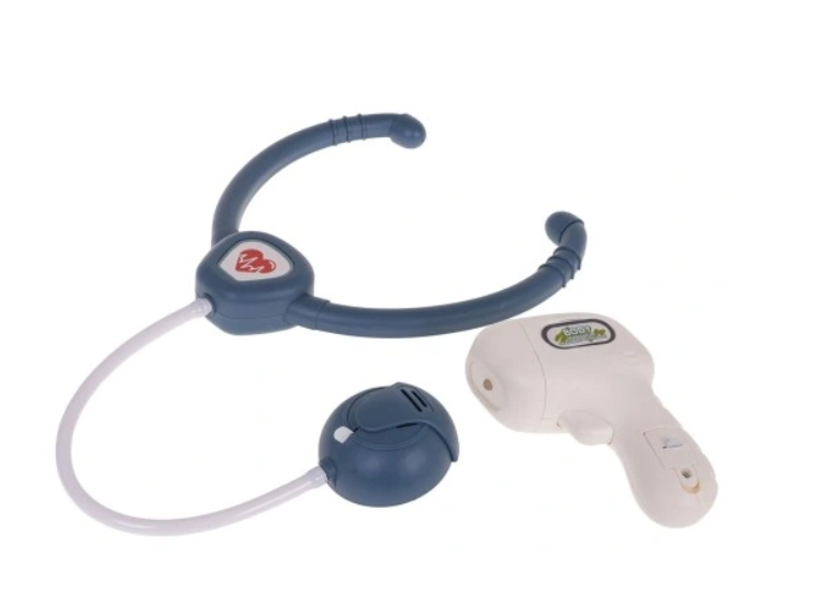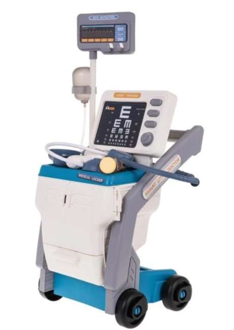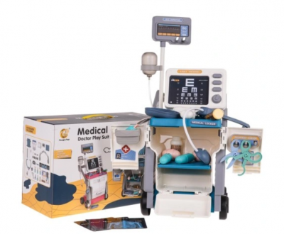 Интерактивный, хорошо оборудованный набор врача со звуковыми и световыми эффектами для детей от 3 лет. Набор состоит из прочной, легкой тележки с большими колесами и удобной ручкой, а также множества инструментов врача. На экране мониторинга кнопки могут использоваться для смены рентгеновских снимков, активации звуков сердцебиения или сигналов тревоги. Панель мониторинга работает от 2 батареек типа АА 1,5 В (не входят в комплект). Стетоскоп издает звук сердцебиения, а термометр — звук измерения температуры и фоновую подсветку. Стетоскоп и термометр работают от 3 батареек AG10 1,5 В (не входят в комплект)