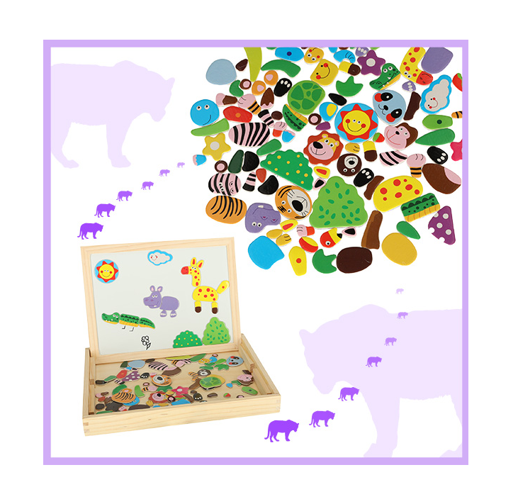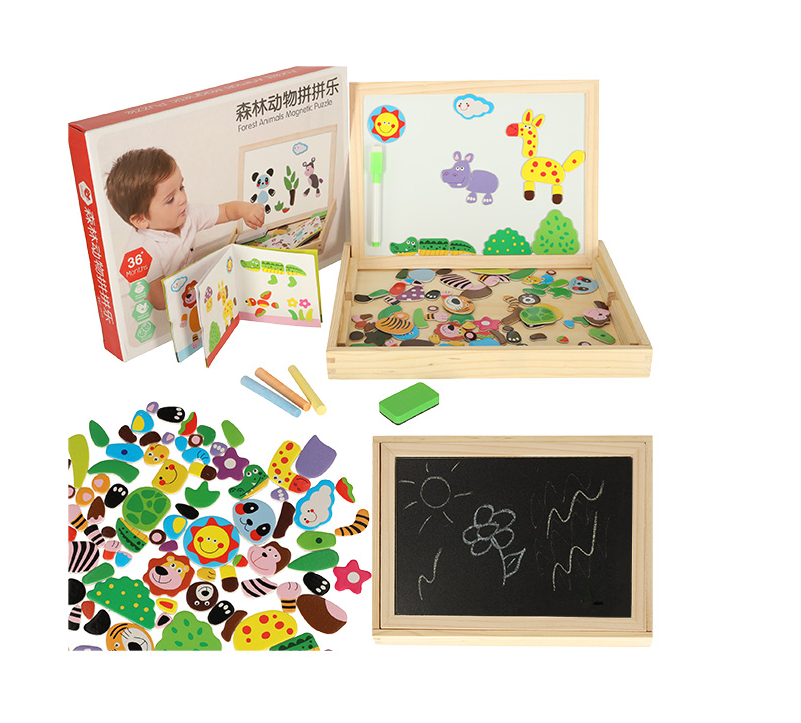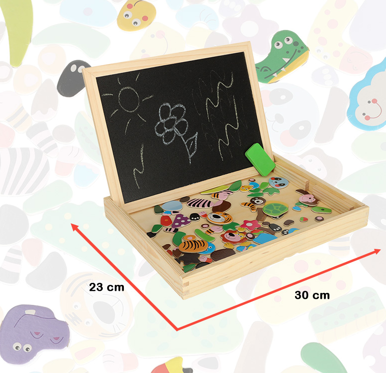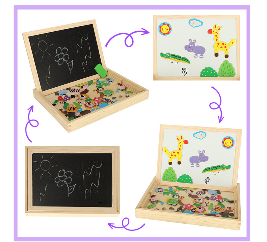 Двусторонняя деревянная доска с магнитными пазлами для раскладывания картинок.