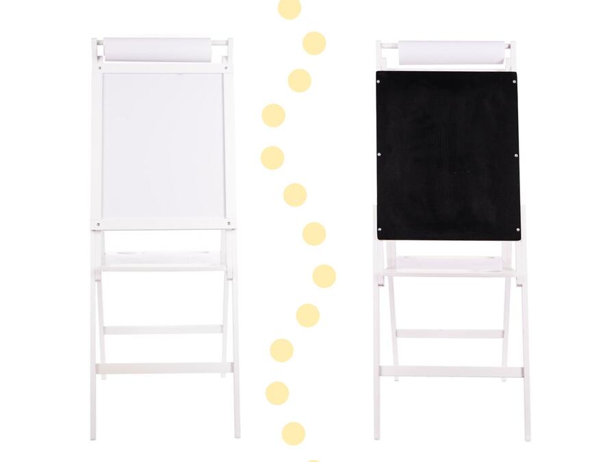 Белая сторона доски предназначена для письма или рисования маркерами, также ее можно прикрепить на магниты. После переворота появится меловая доска.