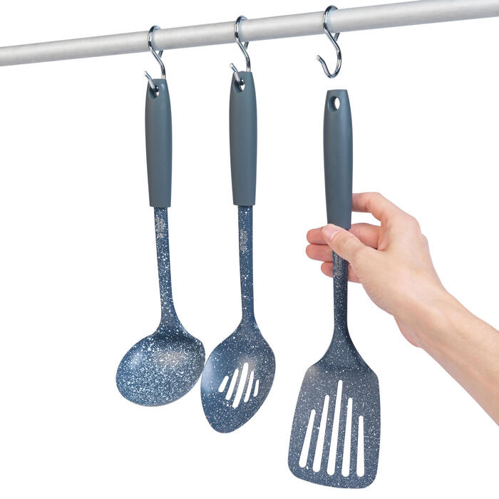 - Благодаря удобным подвесным крючкам на каждой утвари вы можете легко аккуратно убрать их после каждого использования и сэкономить место на кухне.