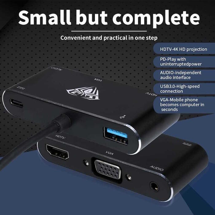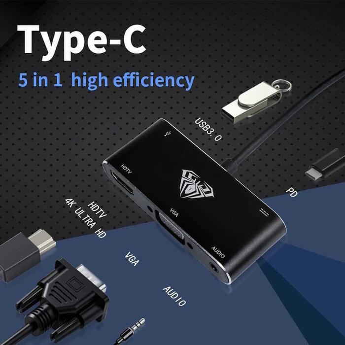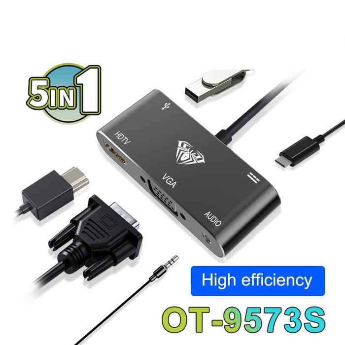 Aula OT-9573S - адаптер 5x USB-C - Hdmi 4K 30Hz / VGA монитор / USB 3.0 / Audio 3.5mm / PD заряд. Многофункциональный адаптер-концентратор с блоком питания — идеальное решение для ноутбуков и других устройств со свободным портом USB-C, обеспечивает зарядку при передаче файлов с карт памяти и передачу данных со скоростью до 5 Гбит/с с использованием портов подключения. Совместимость с MacBook или другим поддерживаемым устройством.