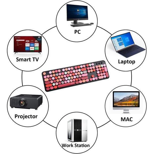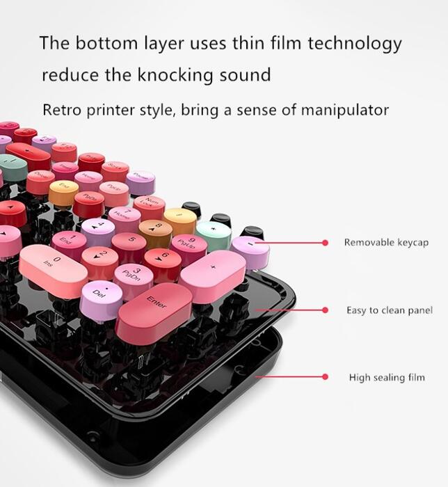 Технология беспроводной передачи 2,4 ГГц обеспечивает непрерывную и стабильную передачу сигнала, может уменьшить помехи сигнала. Полноразмерная клавиатура со 104 клавишами, оснащенная обычной клавиатурой, цифровой клавиатурой и клавишами направления, компактная компоновка, делает вашу работу более удобной. Совершенно новое решение, улучшенная мембранная клавиатура, стиль пишущей машинки в стиле ретро. Дизайн кейкапов с высоким ключом обеспечивает реалистичное механическое ощущение, низкий уровень шума, простоту использования. Клавиатура имеет мультимедийные клавиши, а FN + мультимедийные составные клавиши могут выполнять быстрые операции, такие как воспроизведение, пауза и регулировка громкости. Эргономичный дизайн. Регулируемый кронштейн расположен в нижней части клавиатуры, так что запястье находится под расслабленным углом, что обеспечивает гибкость пальцев. Имеет технологию автоматического энергосбережения, чтобы обеспечить длительный срок службы батареи.