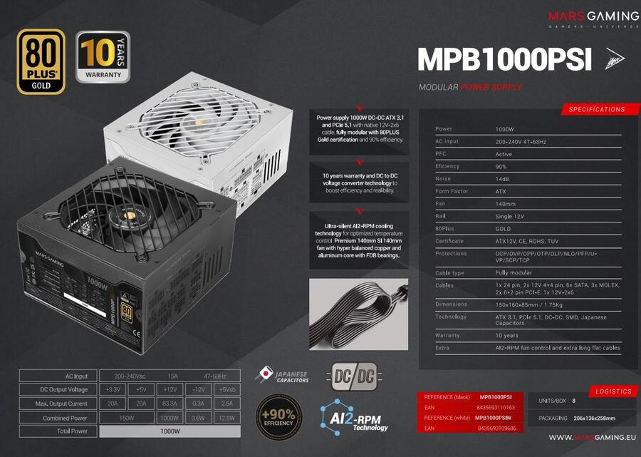 ПОЛНОСТЬЮ модульный блок питания ATX 3.1 MPB1000PSI 1000 Вт переопределяет эффективность и производительность для самых требовательных систем. Благодаря сертификации 80Plus Gold, японским конденсаторам Toshin Kyogo 105º и интеллектуальной модульной конструкции он гарантирует исключительную стабильность, оптимальное управление питанием и безупречную установку. Его собственный разъем 12 В 2x6 с поддержкой PCIe 5.1 обеспечивает эффективную и безопасную подачу питания для видеокарт следующего поколения. Кроме того, он оснащен 140-мм вентилятором SI Extreme Silence и усовершенствованной системой охлаждения AI2-RPM, динамически регулирующей скорость вращения вентилятора с помощью машинного обучения и искусственного интеллекта, что обеспечивает сверхтихую работу и высокий уровень рассеивания тепла.