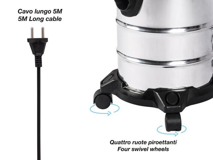 Оснащен четырьмя поворотными колесами и кабелем длиной 5 м для легкого перемещения и использования прибора; и с основанием для хранения всех принадлежностей в отдельных отделениях.