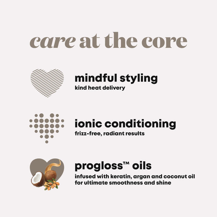 Супергладкие масла Progloss™ — керамический цилиндр с добавлением кератина, арганы и кокоса для максимальной гладкости.