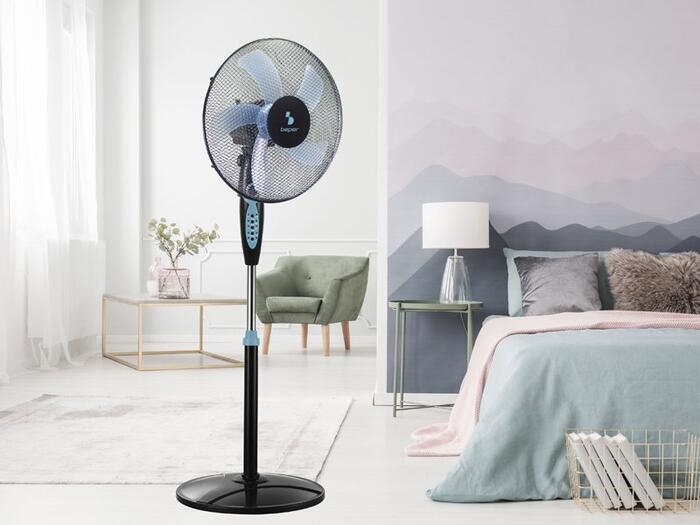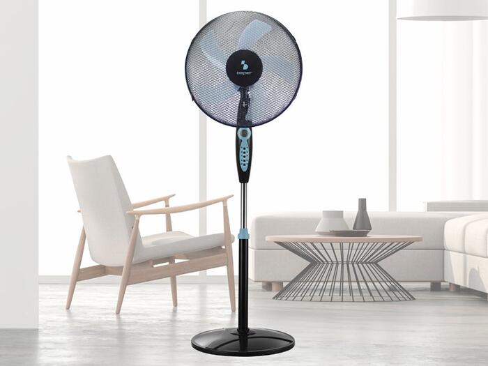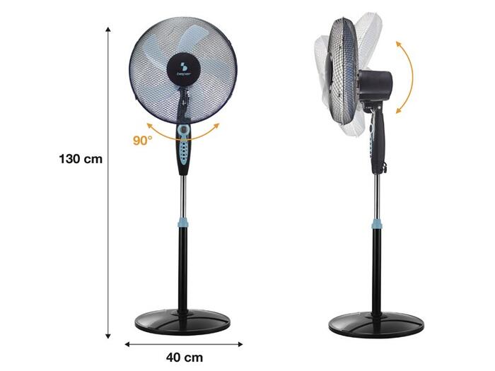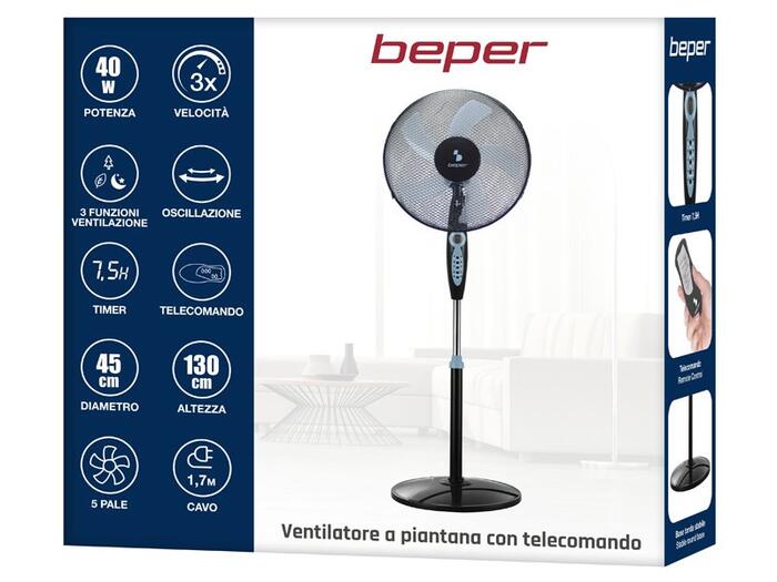 Вентилятор на подставке с трехступенчатой регулировкой воздушного потока и автоматическим горизонтальным колебанием. Оснащен таймером, который можно запрограммировать до 7,5 часов, и тремя режимами вентиляции (нормальный, ветерок и ночь), которые также можно активировать с помощью прилагаемого пульта дистанционного управления для максимального комфорта пользователя. Круглое основание для максимальной устойчивости, металлическая решетка Ø 45 см, 5 лопастей, высота 130 см.