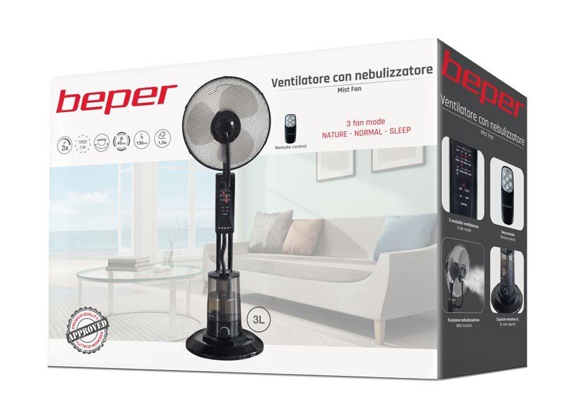 Этот вентилятор диаметром 45 см имеет 3 режима вентиляции с функцией тумана для немедленного освежения любой среды. Вентилятор имеет функцию автоматического поворота на 360 ° и таймер 7 1/2 часа, который можно настроить с помощью прилагаемого пульта дистанционного управления. Емкость бака: 3 л.